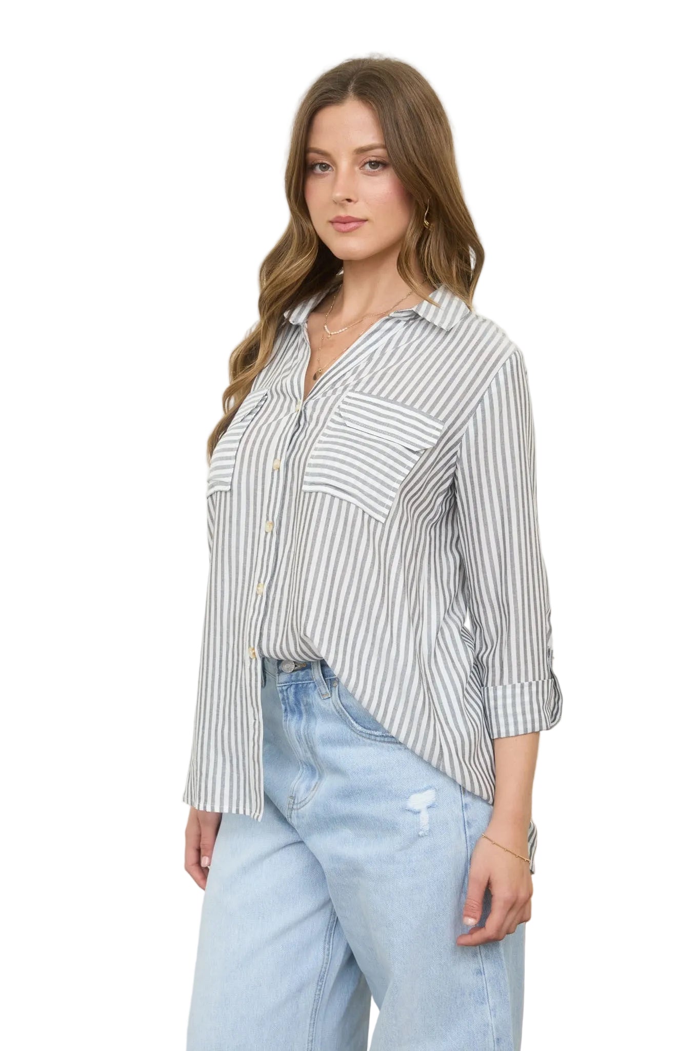 Effortlessly chic and ready for anything, this striped button-down shirt brings casual sophistication to your everyday rotation. Featuring a classic collar, long sleeves with buttoned cuffs, and a handy roll-up tab for those warmer moments, it's designed for versatility. The structured back yoke adds shape while keeping things breezy and unlined. Perfect for layering, dressing up, or keeping it cool—this striped essential does it all with a wink and a smile.
